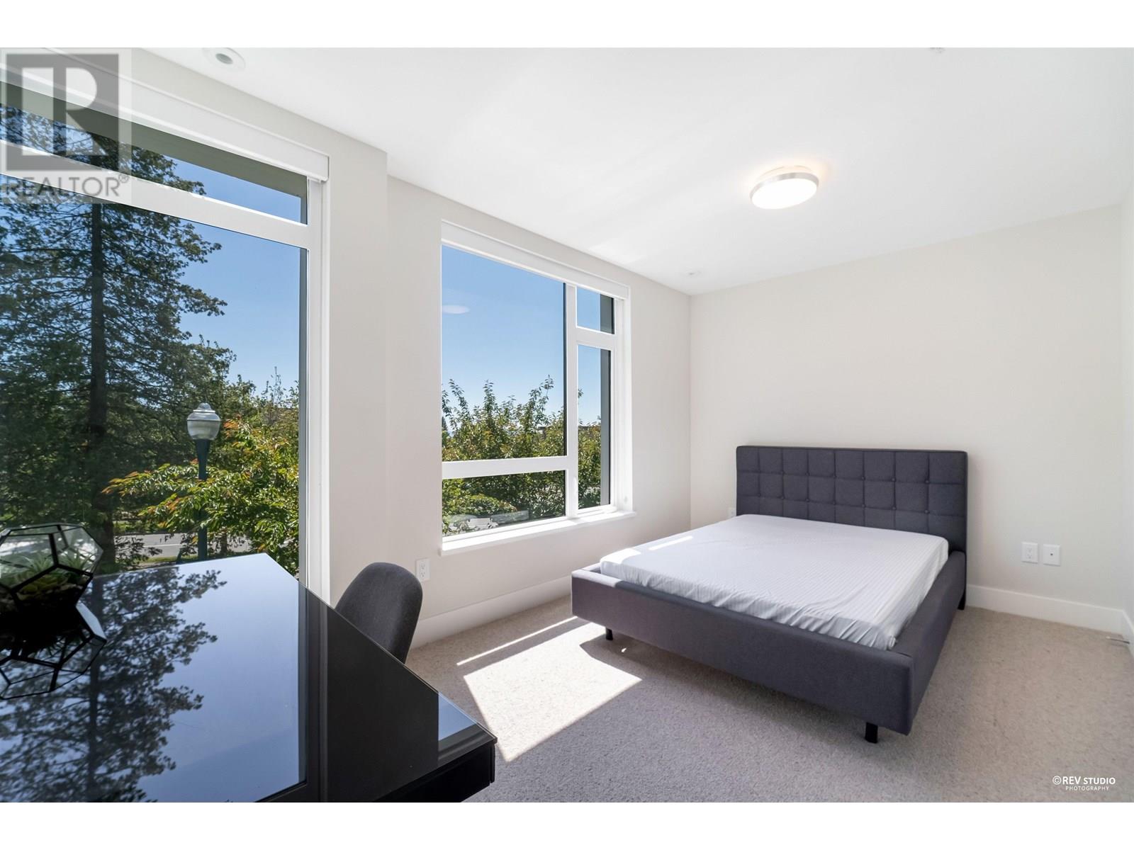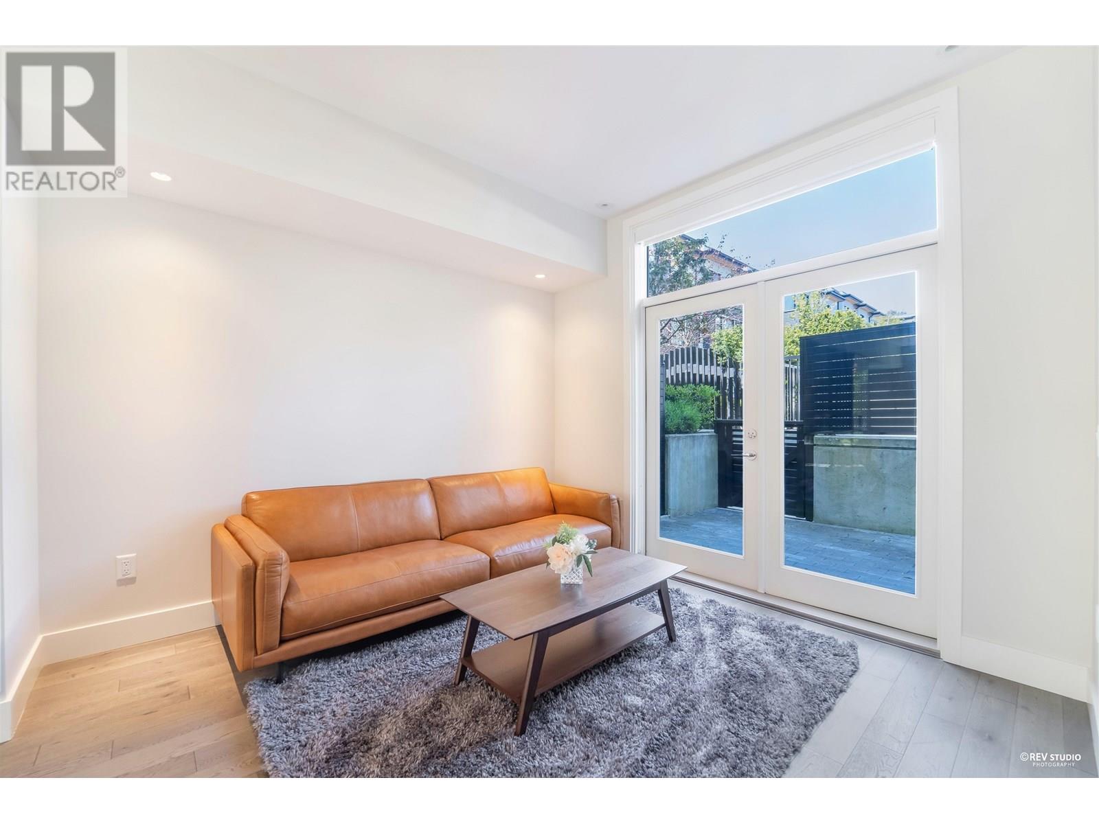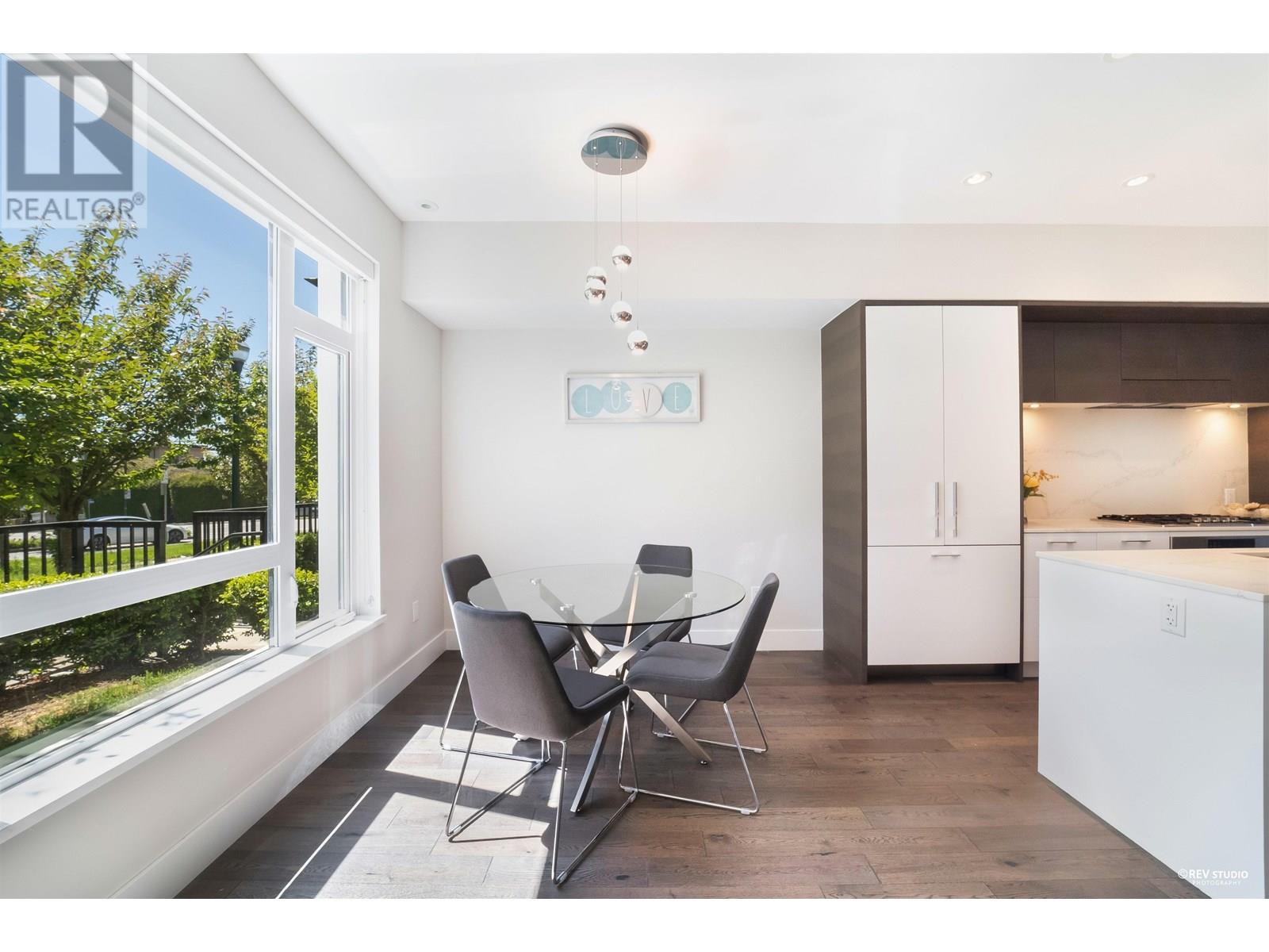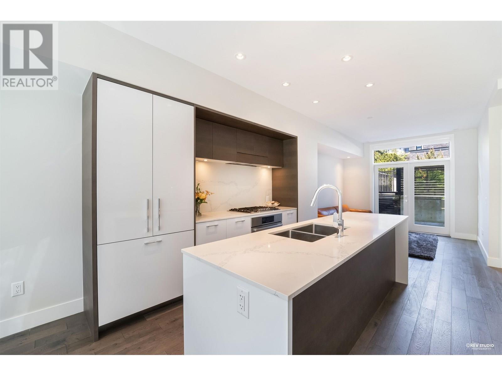 Experience luxury living in this extraordinary 4-level, 3-bedroom + big office townhouse by award-winning Intracorp, with interiors by Trepp Designs. Thoughtfully designed with spacious separate living and dining areas, a high-end kitchen featuring paneled Bosch appliances, stone countertops, redwood veneer cabinetry, and custom pantry millwork. All bedrooms comfortably fit queen-sized beds, complemented by marble bathroom counters and soaring 9′ ceilings. Enjoy ample outdoor space including a private backyard and a stunning top-floor south-facing patio with mountain, greenbelt, and partial Fraser River views. Quietly located on the SOUTH/NORTH-facing side of 59th Ave and within the sought-after Churchill Secondary (IB) catchment-Must-see! 2 Parkings 1 locker (id:62103)