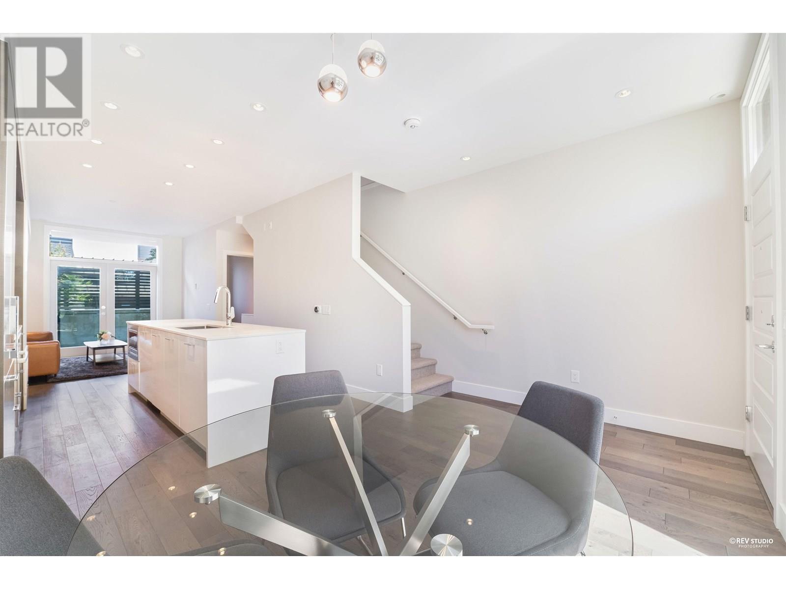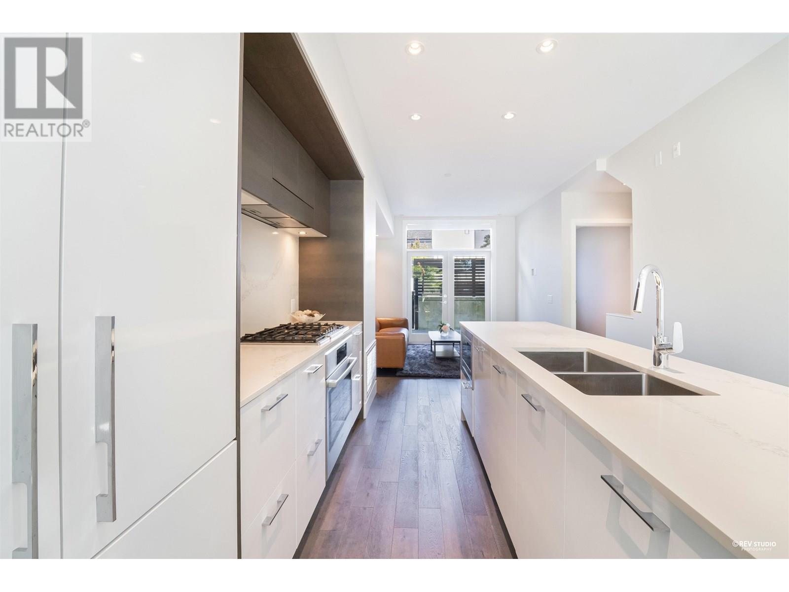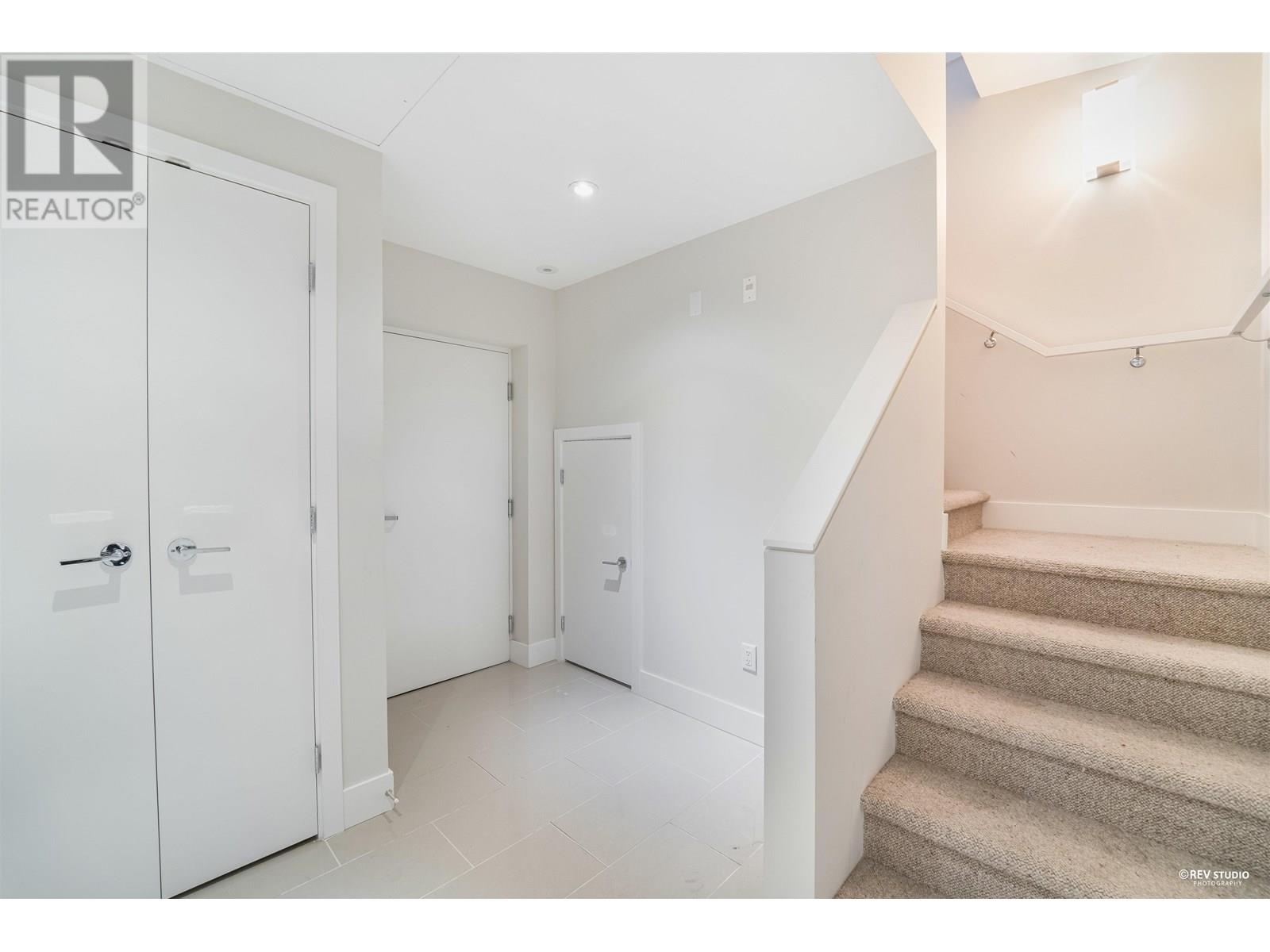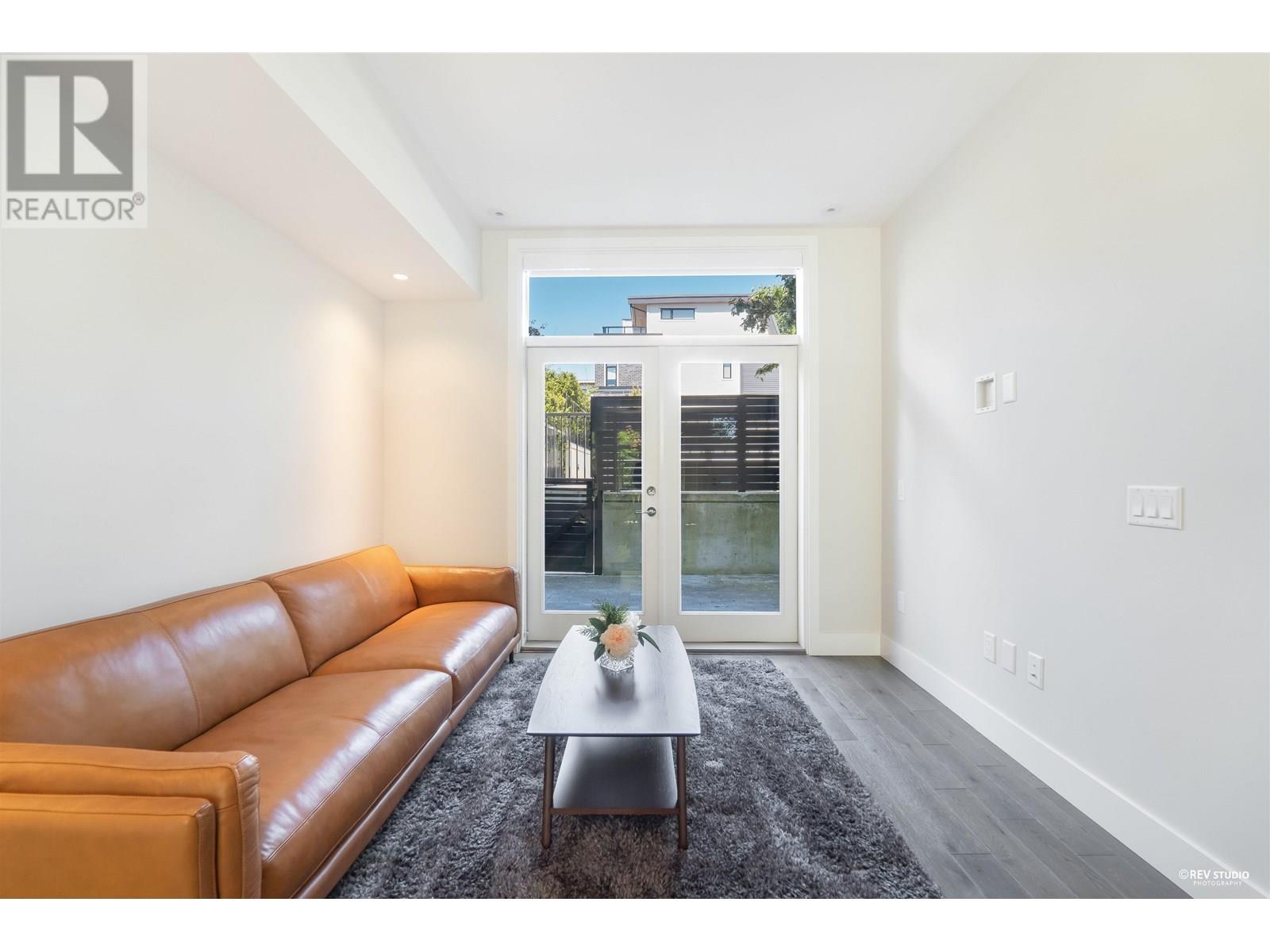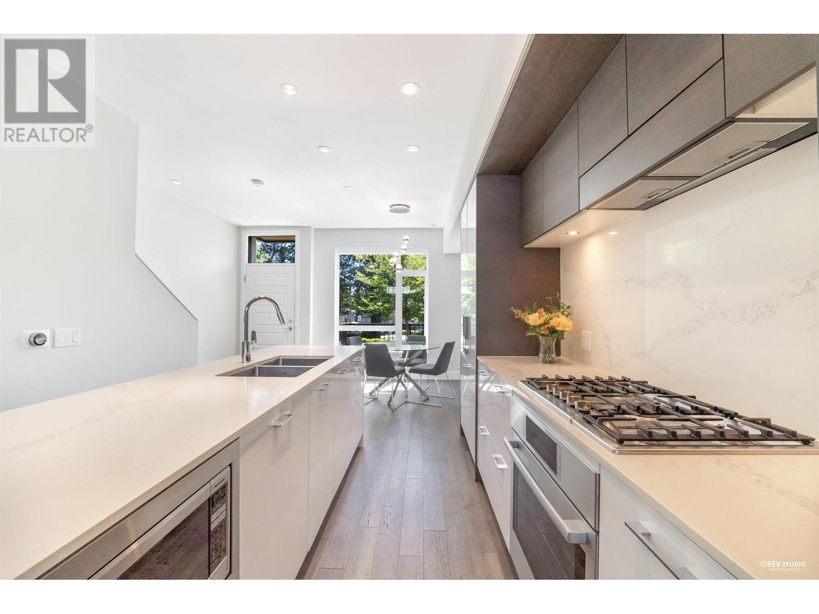 Experience luxury living in this extraordinary 4-level, 3-bedroom + big office townhouse by award-winning Intracorp, with interiors by Trepp Designs. Thoughtfully designed with spacious separate living and dining areas, a high-end kitchen featuring paneled Bosch appliances, stone countertops, redwood veneer cabinetry, and custom pantry millwork. All bedrooms comfortably fit queen-sized beds, complemented by marble bathroom counters and soaring 9′ ceilings. Enjoy ample outdoor space including a private backyard and a stunning top-floor south-facing patio with mountain, greenbelt, and partial Fraser River views. Quietly located on the SOUTH/NORTH-facing side of 59th Ave and within the sought-after Churchill Secondary (IB) catchment-Must-see! 2 Parkings 1 locker (id:62103)