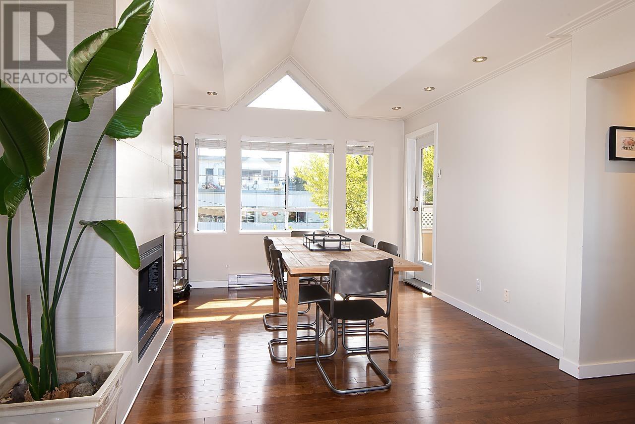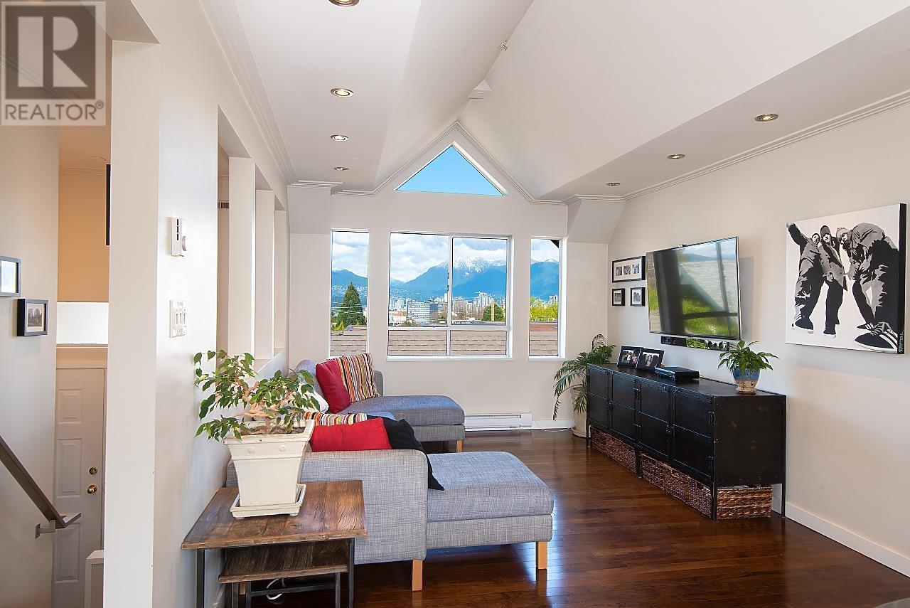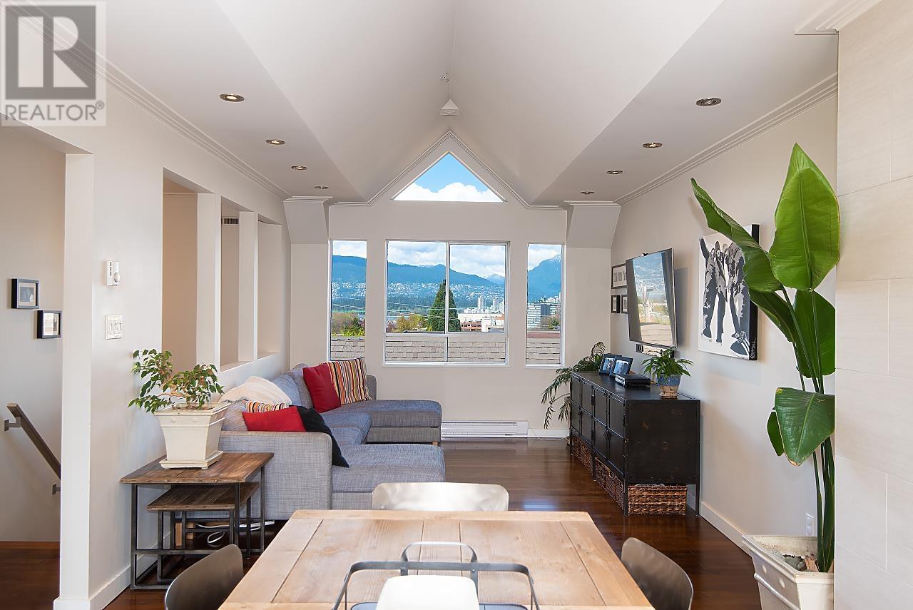 This expansive two-level, two-bedroom penthouse offers the feel of a townhouse with only one shared wall and stunning, unobstructed views of the mountains, ocean, and city skyline. Tastefully renovated in 2012, the home features elegant walnut hardwood flooring, modem lighting, quartz kitchen countertops, soaring vaulted ceilings, and a cozy gas fireplace. Enjoy the bright, south-facing patio off the living room-perfect for soaking in the sunshine and scenery. Ample in-suite storage adds to the convenience. Located directly across from the Arbutus Greenway and community gardens, this is a truly rare offering. 1 Parking and 1 Storage locker. OPEN HOUSE Saturday June 14th 2-4pm & Sunday June 15th 1-:230pm. (id:62103)