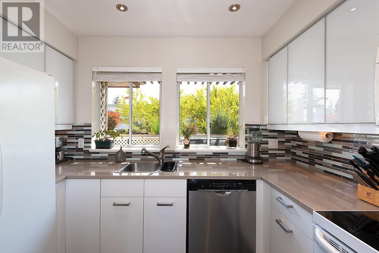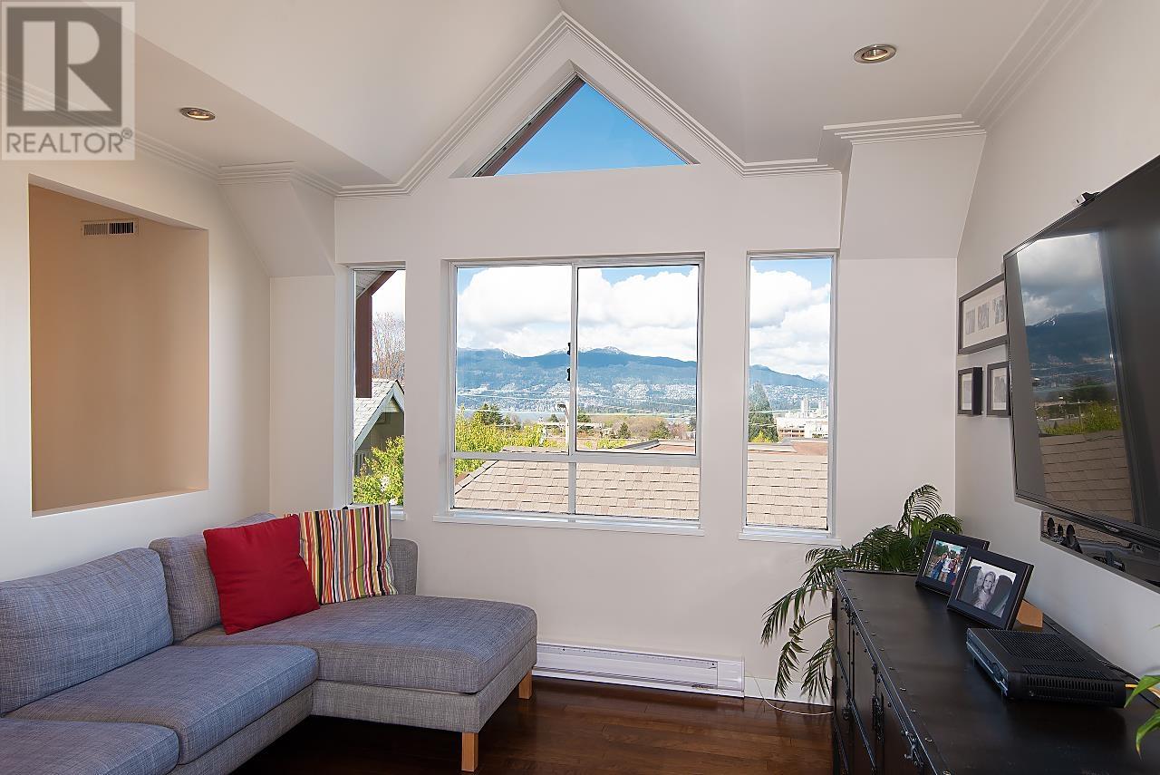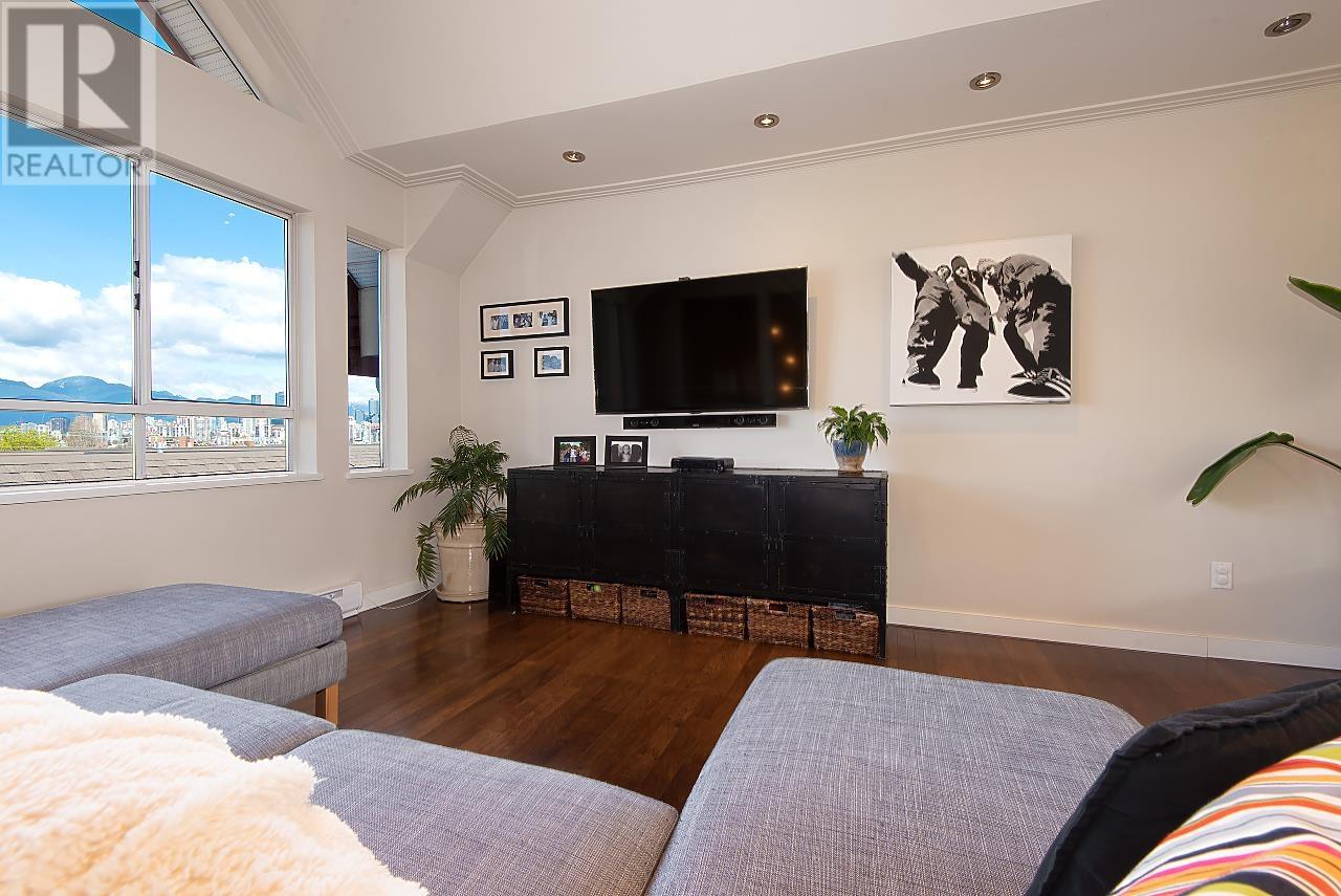 This expansive two-level, two-bedroom penthouse offers the feel of a townhouse with only one shared wall and stunning, unobstructed views of the mountains, ocean, and city skyline. Tastefully renovated in 2012, the home features elegant walnut hardwood flooring, modem lighting, quartz kitchen countertops, soaring vaulted ceilings, and a cozy gas fireplace. Enjoy the bright, south-facing patio off the living room-perfect for soaking in the sunshine and scenery. Ample in-suite storage adds to the convenience. Located directly across from the Arbutus Greenway and community gardens, this is a truly rare offering. 1 Parking and 1 Storage locker. OPEN HOUSE Saturday June 14th 2-4pm & Sunday June 15th 1-:230pm. (id:62103)